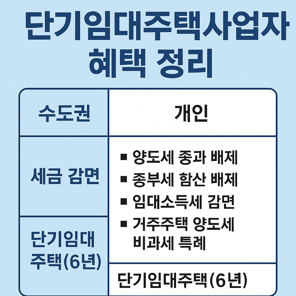 2025년부터 재도입되는 6년 단기임대주택사업자 제도는 수도권 개인 임대사업자에게 다양한 세금 감면 혜택을 제공합니다. 아파트를 제외한 주택에 한해 등록이 가능하며, 임대의무 6년을 채울 경우 양도소득세, 종합부동산세, 소득세, 비과세 특례 등 실질적인 절세 혜택이 주어집니다.